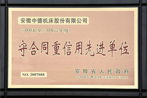 近日,安徽中德機(jī)床股份有限公司被安徽省人民政府授予2005-2006年度“守合同重信用先進(jìn)單位”這一稱號。這也是我公司繼由馬鞍山市工商局、市人民政府、省工商局多次授予此類稱號后,再次獲得的更高級別的榮譽。